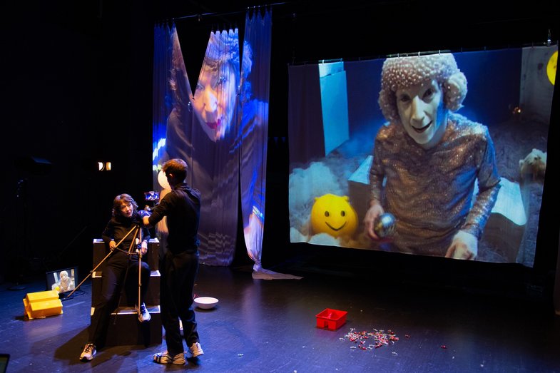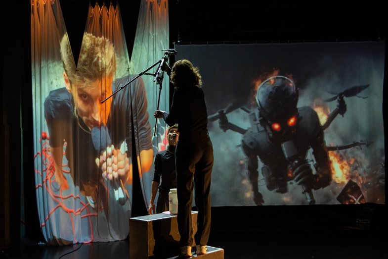 Concept: Interrobang / Play development: Interrobang & Team / Performance: Lukas Jakob Huber, Claudia Splitt, Künstliche Intelligenzen / Dramaturgy: Anna Krauß, Lara Domke / Outside Eye: Nina Tecklenburg / Creative Coding & AI Video: Manus Nijhoff, Alexandre Silveira / Video documentation & trailer: Julia Elger / Equipment: Sandra Fox / Music: Friedrich Greiling / Graphic design: Jürgen Fehrmann / Technical direction & lighting design: Dirk Lutz / Production management: ehrliche arbeit – freies Kulturbüro, Sandra Klöss / Collaboration production: Lara Domke / Company management, communications & social media: Jack Willenbacher / Freelance communications & PR: Tina Ebert