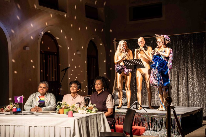 Idee und Konzept: She She Pop, Sandbox Collective / Von und mit: Sebastian Bark, Johanna Freiburg, Raabiya Jayaram, Lisa Lucassen, Mieke Matzke, Ilia Papatheodorou, Shiva Pathak, Nimi Ravindran, Berit Stumpf / Künstlerische Mitarbeit: Natasha Borenko, Rodrigo Zorzanelli / Künstlerische Mitarbeit Indien: Sachin Gurjale, Vinod Ravindran, Joshua Muyiwa / Raum: Philine Rinnert / Kostüm: Lea Søvsø / Mitarbeit Kostüm: Rita Rozhkova / Konzeption Video: Benjamin Krieg / Lichtdesign & Technische Leitung: Claes Schwennen / Technische Beratung: Marius Bratoveanu, / Licht, Video & Technisches Management Deutschland-Tour: Marius Bratovean, Manuel Louis Horstmann, Michael Lentner, Claes Schwennen / Licht, Video & Technisches Management Indien-Tour: Niranjan Gokhale / Assistenz Technik & Produktion Indien: Anand Samudre / Dramaturgische Beratung: Foad Esfahani / Hospitanz: Fanny Kempter / Deutsche Live-Übersetzung: PANTHEA / Dokumentation Indien: Richa Bhavanam, Anushka Meenakshi / Social Media und Hospitality India: Leya Mammen / Coaching: Anisha Imhasly, Yumin Li / Coaching Musik: Max Knoth / PR & Kommunikation: ehrliche arbeit – freies Kulturbüro / PR & Kommunikation Indien: Sridevi Rao / Kommunikation: Tina Ebert / Produktion: Tina Ebert, Aminata Oelßner, Medha Nidhi S, Elke Weber / Company Management Sandbox Collective: Raabiya Jayaram, Shiva Pathak, Nimi Ravindran, Medha Nidhi S / Company Management She She Pop: Aminata Oelßner, Elke Weber