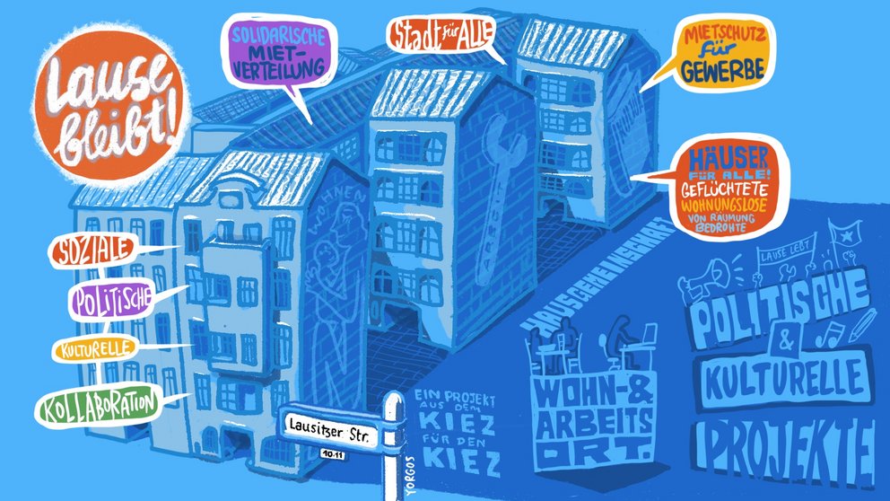 We are artists and craftspeople, small businesses from graphic designers to one-woman booking agencies, NGOs and precariously employed scientists, political creatives and freelance writers – and we are all losing our income in the current crisis. We are fighting to not lose the very last means of production we have left: our office, our workshop, our studio. The safety nets now being stretched over large companies leave us feeling the brunt of the falling debris. As an absolute minimum, we therefore demand that the city of Berlin, but also the city’s property owners, at least secure our spatial existence! Housing communities like ours, Lause, are social laboratories: mutual support with paying rent, information exchange and virtual meetings are our answer to the isolation of quarantine. We’re joining the fight for houses for everyone: refugees, the homeless and those in danger of eviction.