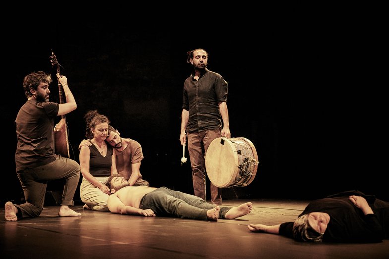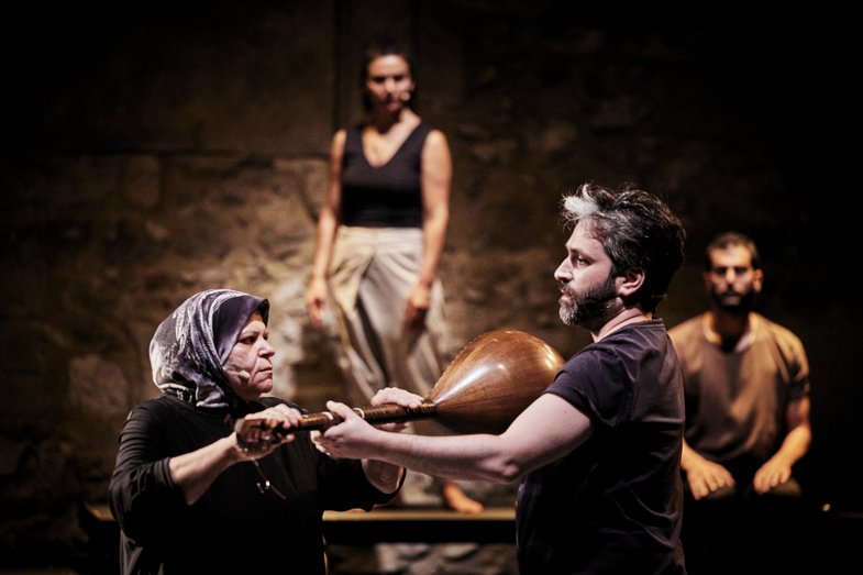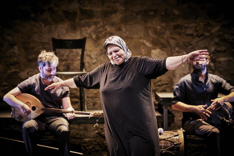 The live music by Ali Hout and Abed Kobeissy (percussion and buzouk) draws on the songs of those very families, sung in moments of both grief and joy. Thus, a vibrant anthology of the cultural heritage of Arab folk songs unfolds before the audience. The meandering songs reflect the endless pain of women who carry within them both unshakeable hope and paralysing fear. And yet, amidst all the suffering, moments of hope shine through.
