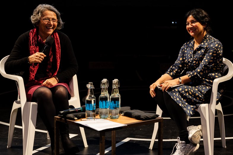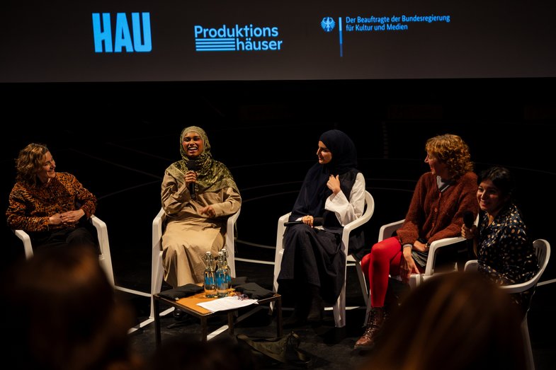 In the subsequent discussion with Dr. Azadeh Sharifi, Stella Konstantinou (HAU to connect) and participating neighbours, Hülya Karci and Gob Squad discuss connections, continuities and breaks, as well as the role of areas of work such as outreach.