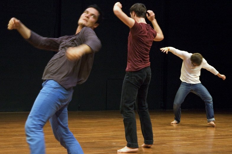 “Kneeding” is a choreography for three dancers, exploring the relation between what happens inside and outside of a body: how inner processes manifest themselves externally and how the exterior influences what is within. The palpable reality of matter – the dancing body and its tactile surroundings – is combined with the immaterial reality of imagination. In this way, “Kneeding” negotiates between physicality and psychology, between “kneading” and “needing”. With continuous, pumping movement “Kneeding” works its way through the interlocking spaces of the mind and body, sustaining an ever-shifting environment. Dancing, the performers challenge their own self-perception, generating an introspection that rouses both centripetal and centrifugal force. Seated on three sides of the dancers, the spectators become close witnesses of this undertaking. They are complicit in the act of producing and collecting the images that emerge, and at times literally implicated in the events that materialize amidst them.