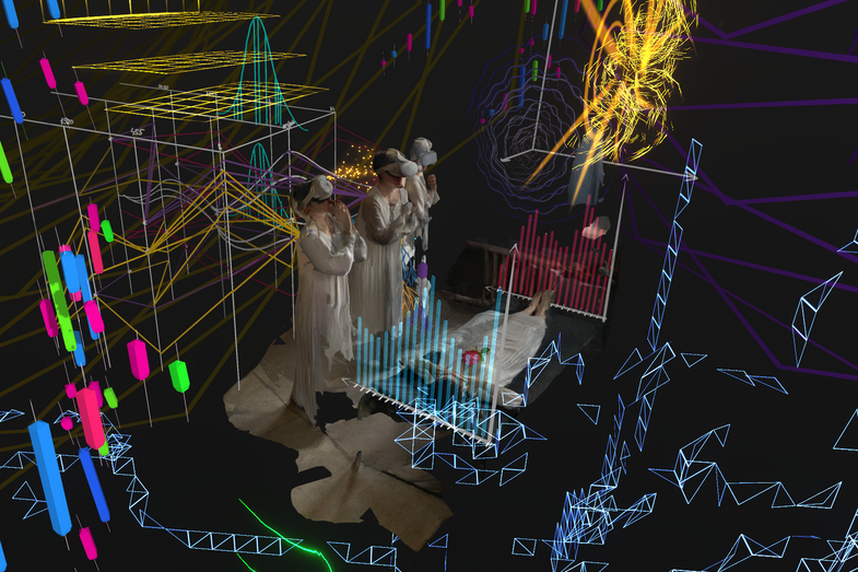 “Data Death” is a VR project created in the process of studying data lifecycles and rituals in the technological era. With her artwork, Nadezhda Bey draws attention to the ethics of data usage and its utilization. What can be considered a death for data? Is there any outdated, unnecessary or wrong data? The viewers of the artwork dive into a digital environment with an iconostasis and ceremonial monument surrounded by different data representations. There is no possibility to interact with it as the data is no longer live. What is left to the viewers is taking a moment of silence and listening to a data choral made in memoriam of it.