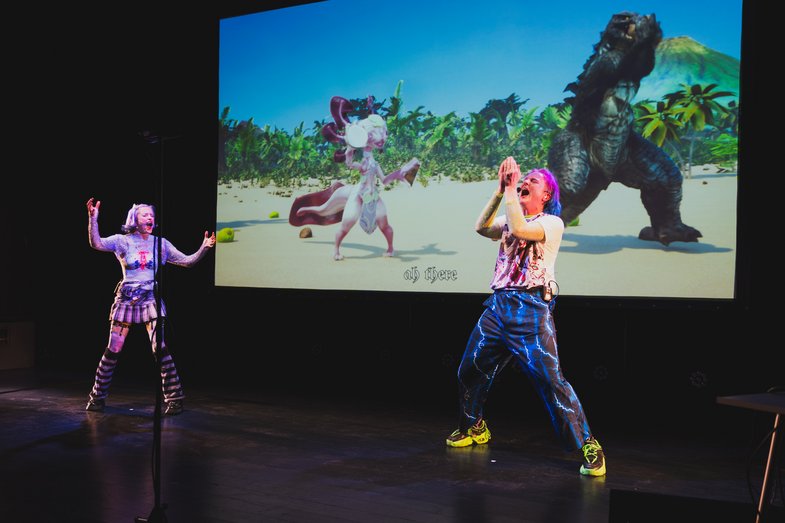 “Afterlife” is a full-length computer game opera developed by the interdisciplinary arts and music duo Only Slime, consisting of Tobi Pfeil and Claudia Cox. The opera questions life after death and the meaning of life, playfully combining elements from Greek mythology, contemporary internet-culture, simulation theory, AI-generated material and computer-game storytelling techniques in an operatic form that is both fun, thought-provoking and transgressive in its combination of music, technology and live performance.