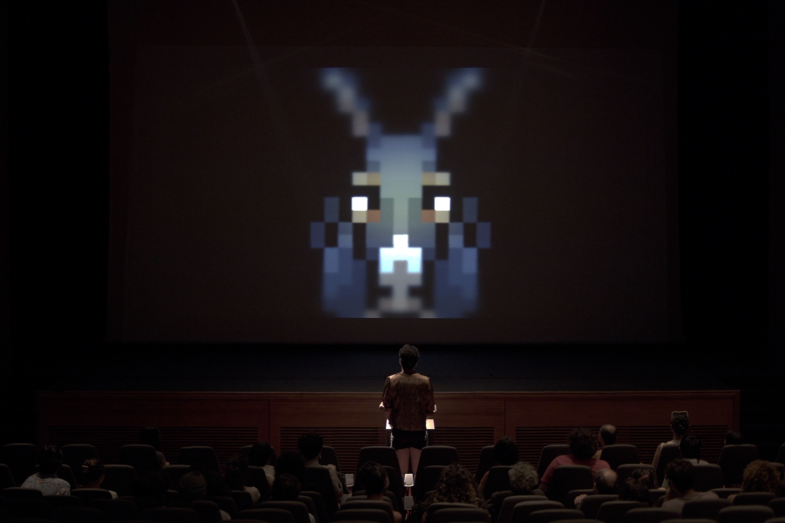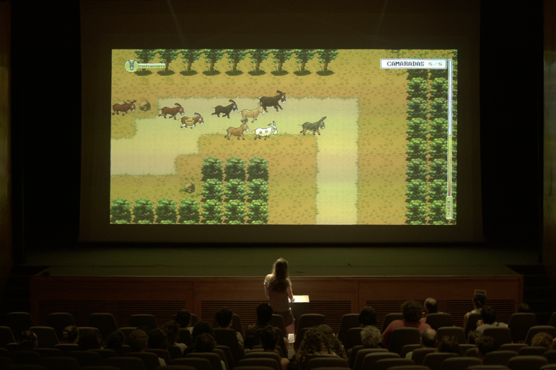 The story of “asses.masses” is told through visual text in German language, which is delivered on screen in dialogue boxes that are controlled by the players. There are no voice overs or actors performing the text aloud. “asses.masses” requires that players listen for audio cues, read text from the screen, and use their hand dexterity to operate a game controller. The pace of the game is directly controlled by the player and can change depending on the audiences; this includes how quickly players progress through the text.