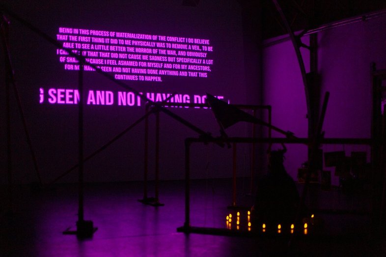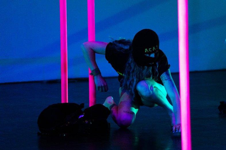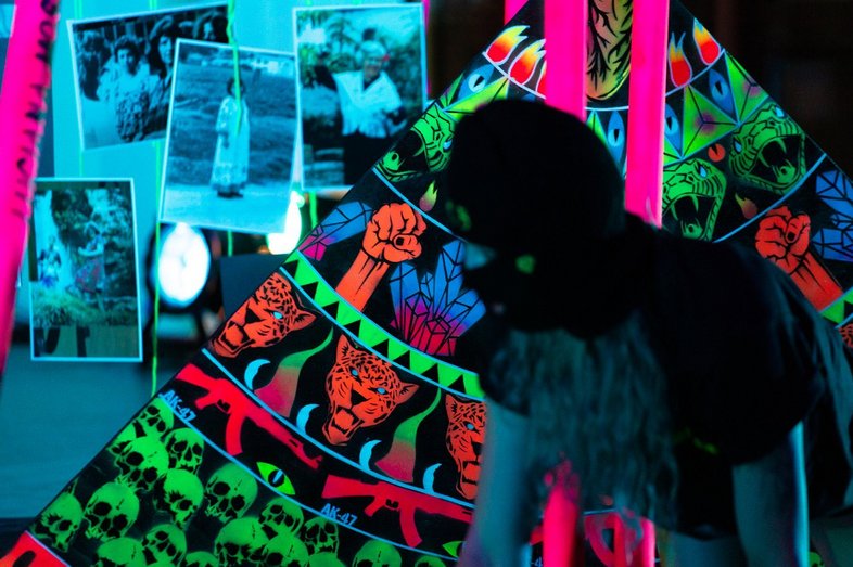 A hooded character named La ChicaScratch embarks on a generational journey to uncover the hidden history of her mother, a young militant activist in 1970s Colombia. In the process, she reflects on her own journey: the dark reasons that led her to flee Colombia for political exile in the Netherlands ten years ago. Pau(la) Chaves Bonilla's new performance “House of Desaparecidxs” is the testimony of one among thousands of Colombians who fled the country to save their lives. People who had no choice but to leave their homes after being threatened because of their political affiliation, as sexual dissidents, as community representatives, or because they sought justice for criminalized, disappeared, or murdered relatives. “House of Desaparecidxs” opens its doors to these censored stories. We enter a utopian space where we travel through non-linear memories of the present, future, and past, and the line between the realm of life and death blurs. “House of Desaparecidxs” evolves into a technology of resistance in exile, finding a way to restore dialogue with its origins and history. A speculative world – in this case a neon psychedelic haunted house – materializes as a reparative political and spiritual act. The dialogue between embodied archived memories, recorded text messages on Whatsapp, fragments of zoom interviews, manifestation of ghosts from another world and live testimonies.