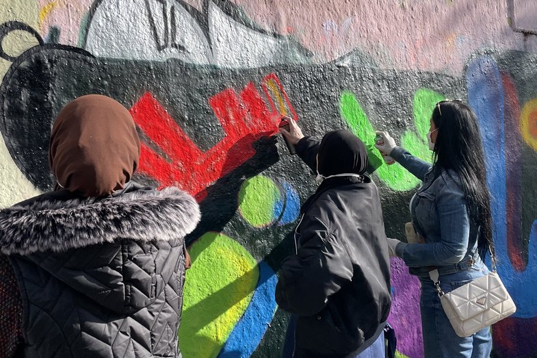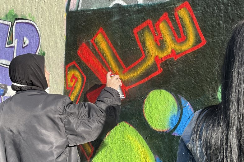 Project management: Peira und Klara Mohammadi / Neighbors from Mehringplatz: Ahlam, Asmaa, Maysa, Rania, Neswa, Saba, Yamam / Artist workshops: Mayada Alkayal (Mal- und Drucktechniken), Ziad Sheno (Kalligrafie), Nancy Rohde (Graffiti) / Creative collaboration: Mahsa Nejad, Elsa Kleé, Alex Klütsch / Artistic collaboration mural: Elnaz Eslami, Susan Azizi, Ziad Sheno / Artistic education: Stella Konstantinou (HAU to connect)