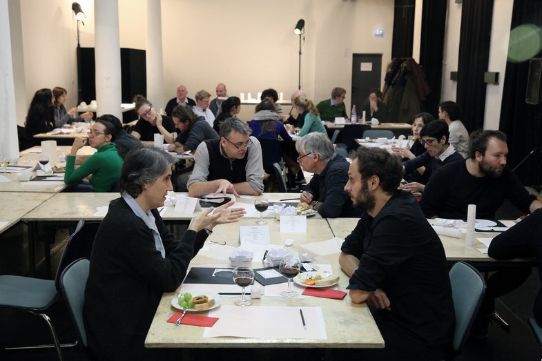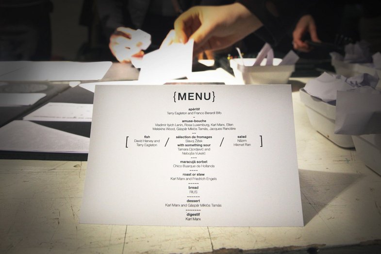 Marxistische Texte zu Klassenkampf und Revolution werden als Sechs-Gänge-Menü auf die Bühne gebracht und in bekömmlichen Happen gemeinsam mit anderen Gästen verspeist, gelesen und diskutiert. Als Gastgeber serviert der Künstler Bojan Djordjev den Marxismus als eine Möglichkeit, die heutige Gesellschaft aus einer anderen Perspektive zu betrachten. Als weitere Appetizer werden aktuelle Theorie-Ansätze von Franco “Bifo” Berardi, Ellen Meiskins Wood und Tamara Djordjević gereicht. In der deutschen Version (17.+18.11.) übernimmt der Performer Joachim Robbrecht die Gastgeberrolle.
