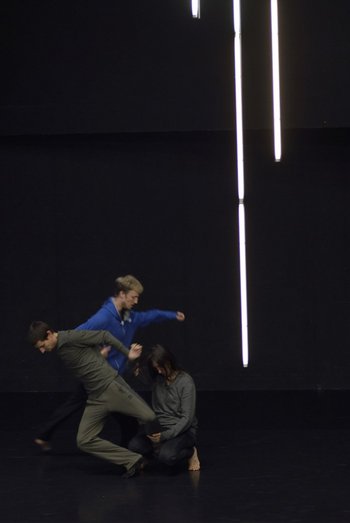 Was geschieht, wenn mehrere Tänzer*innen gleichzeitig ihre Bewegungsentwürfe im Raum solistisch betrachten und nicht, wie gewöhnlich, im Kontext eines Gruppenstücks? In einer gemeinsamen Bühnenarbeit greifen der Choreograf Laurent Chétouane, der Lichtdesigner Jan Maertens und die Tänzer- und Choreograf*innen Ioannis Mandafounis, Mikael Marklund und Roberta Mosca das Thema des Zusammenseins auf. Sie entwickeln Soli, die gleichzeitig im Raum geschehen und die das vielschichtige Begriffsfeld von Begegnung, Verflechtung, Überschneidung und Zusammenstoß verhandeln. Was geschieht, wenn jede*r der drei Tänzer*innen die eigene Präsenz nicht nur in einem Teil, sondern im ganzen Raum verortet?