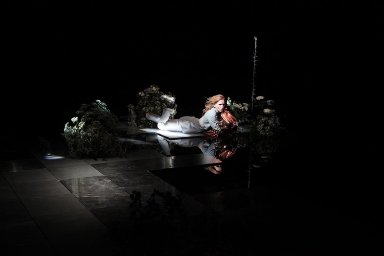 In einer verzauberten Landschaft aus Blumen, Metallfliesen und Wasser verkörpert die Choreografin und Performerin Kat Válastur verschiedene weibliche Archetypen und Personas. Die spätmittelalter-liche Mystikerin Marguerite Porete, die Figur der Monkey, der Tochter in Tarkovskys Film “Stalker”, oder die Figur der Lady Jane Gray, die in einem Gemälde von Delaroche dargestellt ist, materialisieren sich in diesem opernhaften Bekenntnis über die Konstruktion des Selbst und der Identität. Kat Válastur taucht in ihr Bewegungsgedächtnis ein und nutzt ihre imaginäre und visuelle Sprache, um die kaleidoskopische Erfahrung einer Künstlerin in der heutigen Zeit zu erforschen. Mit Hilfe der Geister von Frauen der Vergangenheit und Gegenwart, die unterdrückt, ausgegrenzt, missbraucht, verbrannt oder enthauptet wurden, verwandelt sie den Bühnenraum in eine Zone, eine eingekapselte Welt und ein potenzielles Zuhause mit magischer Kraft, aufgeladen mit weiblicher Transzendenz und Spiritualität. Die Film-Version von “Eye, Lash!” war im März 2021 auf HAU4 zu sehen. Nun wird die Arbeit endlich auf der Bühne vor Publikum gezeigt.