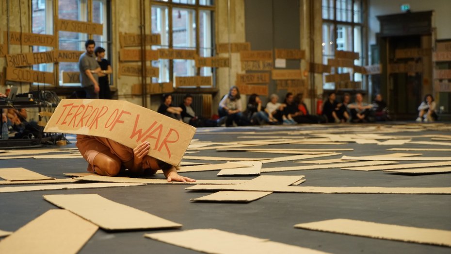 Drei Performerinnen in Putzkitteln arbeiten sich durch hunderte von Pappschildern, die den Boden bedecken. Sie zeigen ein Schild nach dem anderen und kleben es an die Wand, den Raum mit häufig politisch tendenziösen Phrasen füllend: “die here”, “Gaza party”, “immigrant on sale” oder “impotent terror”. Dabei lachen die Performerinnen von “Laughing Hole”, in dieser ebenso absurden wie existenziellen Langzeit-Performance, sechs Stunden lang permanent und bis zur Erschöpfung. Eine verstörende und intensive Erfahrung, entstanden als Reaktion auf das illegale US-Gefängnis Guantánamo und die mit ihm verbundene Ideologie.