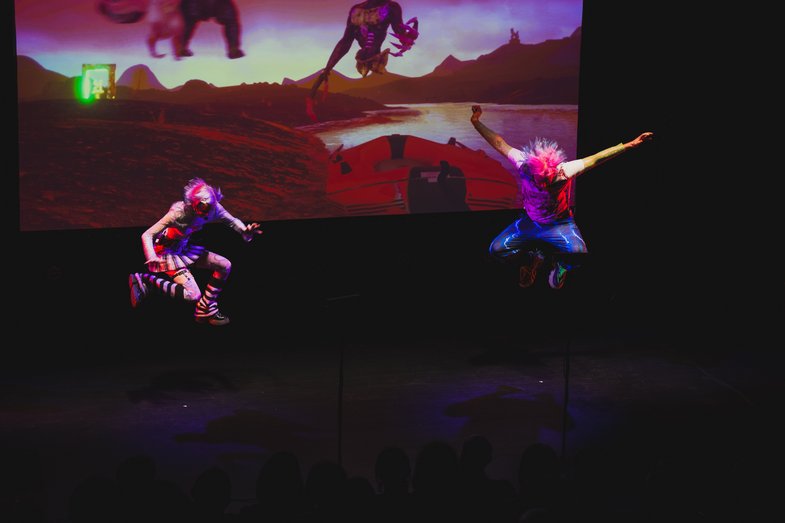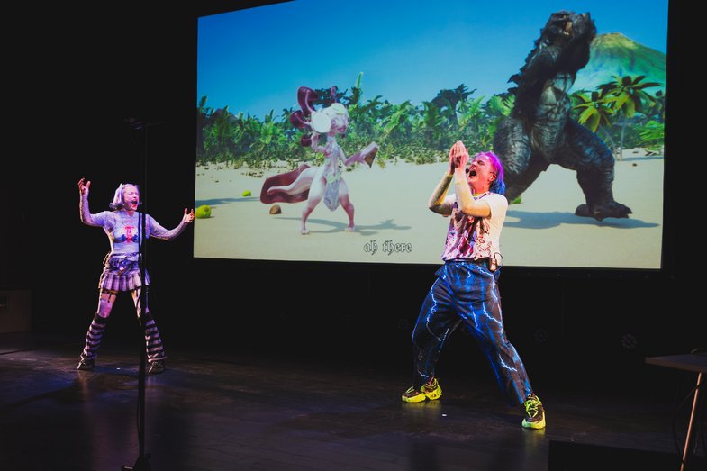 In dieser Computerspiel-Oper begibt sich das norwegische Duo Only Slime in einer simulierten Unterwelt auf eine surreale Suche nach Sinn. Mithilfe von Motion-Capture navigieren die Performer*innen ihre Avatare live durch Landschaften, die von Dantes “Inferno” oder von den Games “Half-Life” und “Final Fantasy” inspiriert sind. Dazu präsentieren sie Autotune-Vocals, die nach schrillem Hyperpop klingen.