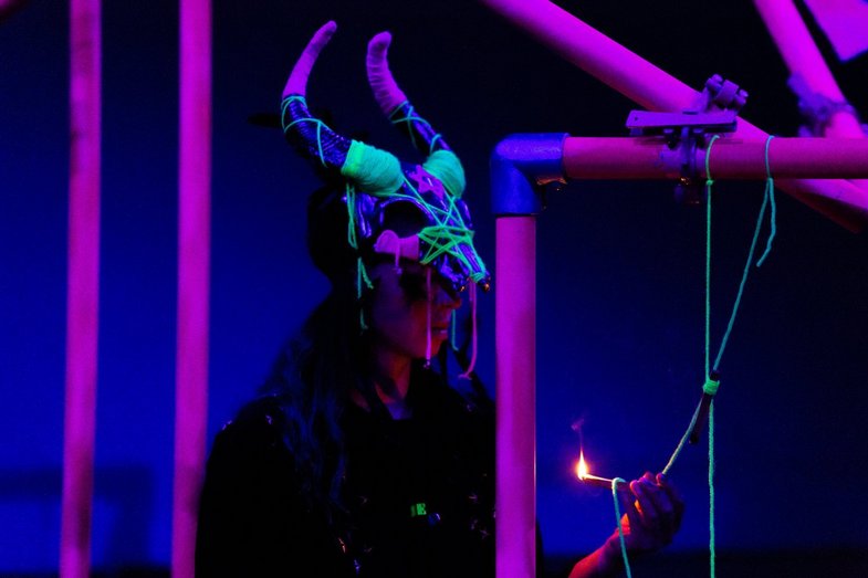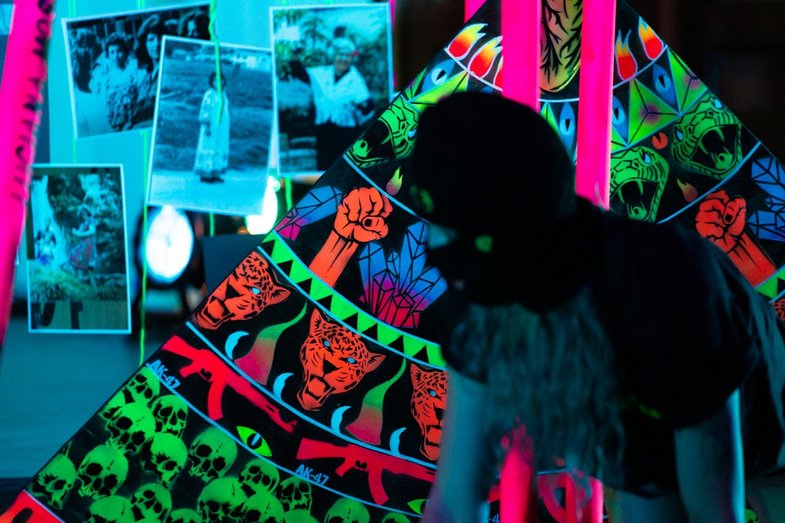 Eine vermummte Figur namens La ChicaScratch begibt sich auf eine generationenübergreifende Reise, um die verborgene Geschichte ihrer Mutter, einer jungen militanten Aktivistin im Kolumbien der 1970er Jahre, aufzudecken. Dabei reflektiert sie über ihre eigene Reise: die dunklen Gründe, die sie vor zehn Jahren dazu brachten, aus Kolumbien ins politische Exil in die Niederlande zu fliehen. Pau(la) Chaves Bonillas neue Performance “House of Desaparecidxs” ist das Zeugnis von einer unter Tausenden Kolumbianer*innen, die aus dem Land flohen, um ihr Leben zu retten. Menschen, die keine andere Wahl hatten, als ihre Heimat zu verlassen, nachdem sie wegen ihrer politischen Zugehörigkeit, als sexuelle Dissident*innen, als Community-Repräsentant*innen oder weil sie Gerechtigkeit für kriminalisierte, verschwundene oder ermordete Angehörige suchten, bedroht wurden. “House of Desaparecidxs” öffnet seine Türen für diese zensierten Geschichten. Wir betreten einen utopischen Raum, in dem wir durch nicht-lineare Erinnerungen an die Gegenwart, Zukunft und Vergangenheit reisen und die Grenze zwischen dem Reich des Lebens und des Todes verschwimmt. “House of Desaparecidxs” entwickelt sich zu einer Technologie des Widerstands im Exil und findet einen Weg, den Dialog mit seinen Ursprüngen und seiner Geschichte wiederherzustellen. Eine spekulative Welt - in diesem Fall ein neonfarbenes psychedelisches Geisterhaus - materialisiert sich als ein reparativer politischer und spiritueller Akt. Der Dialog zwischen verkörperten archivierten Erinnerungen, aufgezeichneten Textnachrichten auf Whatsapp, Fragmenten von Zoom-Interviews, Manifestation von Geistern aus einer anderen Welt und Live-Zeugnissen.