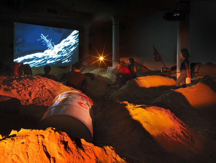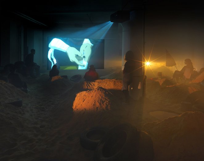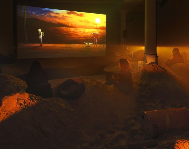 Die Installation von “Delete Beach“ im Houseclub beschwört eine seltsame, melancholische Küstenlandschaft aus einer anderen Dimension, die zum Schauplatz einer ausgedehnten Animationswelt wird.