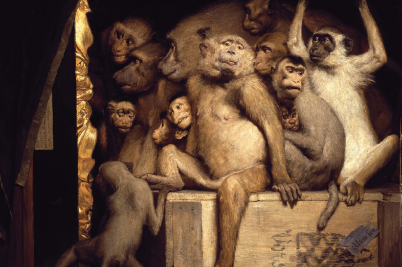 In Reckes “Die Kränkungen der Menschheit” legt sich ein Bild über das andere und lässt einen hybriden Raum zwischen Museum, Zoologischem Garten und Labor entstehen: eine Horde Affen, die die Bühne bevölkert; eine kleine Museumsgruppe auf einem Streifzug; eine große Gruppe von Menschen, die Muster in den Raum zeichnet. Der Abend führt uns an jene fragilen Momente, an denen eine Vorstellung von Welt durch eine andere abgelöst wird. Dabei geht es um das Zeigen, das Ordnen und den Wunsch zu verstehen. Es ist ein Stück über eine Gesellschaft, die von ihrer eigenen Vergangenheit eingeholt wird.
