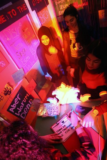 Am 18.01.hatten wir unser erstes Treffen in der Schule und haben gemeinsam ein „Brainstorming" zum Thema durchgeführt. - Das Protokoll verzeichnet folgende Vorhaben: „Am Eingang befindet sich eine Art «Späti»; dort muss man erstmal warten, bevor man rein kann. Es gibt Saft und Kuchen, und man muss sich sein eigenes Geld drucken (zum Bezahlen) und die Eintrittskarte. - Es gibt 3 Eingangstüren. Dahinter ist es dunkel, voller Qualm und manchmal blitzt es... Einige gruselige Überraschungen wird es geben, dann geht es weiter mit einer Bahn, die wirklich sehr abrupt vor einer «Disko» hält, in der es laute Musik gibt und man sich kennenlernen kann. - Man kann kurz tanzen und dann geht's eine Leiter hoch zum Heiratsautomaten. Dort steckt man das Geld hinein, bekommt eine Urkunde und zwei Ringe aus Gummibärchenmasse. Reis fliegt in die Luft, man hört Musik und danach geht's eine andere Leiter hinunter, und man ist wieder draußen.“